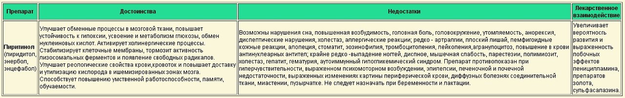 ПРИТИНОЛ усиливает транспорт глюкозы через гематоэнцефалический барьер, повышает ее утилизацию в условиях, когда потребление кислорода тканями снижено, ускоряет окисление глюкозы, уменьшает избыток образования молочной и уксусной кислот в тканях мозга, повышает устойчивость ткани мозга к гипоксии, способен стабилизировать клеточные мембраны и улучшать их функциональное состояние. Пиритинол показан при широком круге психоорганических синдромов различного происхождения, сопровождающихся нарушением памяти, мышления. способности к концентрации внимания, быстрой утомляемостью, дефицитом побуждений и мотиваций, при олигофрении, энцефалопатии, ревматоидном артрите, в комплексной терапии посттравматических энцефалопатии, нарушений мозгового кровообращения нейроинфекций, интоксикаций. При этом пиритинол является одним из немногих ноотропных препаратов, обладающих значительным количеством серьезных побочных эффектов и противопоказаний.